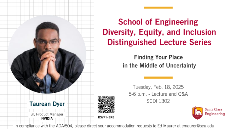 Pyxis Partners Coffee Chat - 11 a.m. - 1 p.m. - SCDI Central Lobby Attention Mechanical Engineers and Electrical Engineers! Pyxis Partners, a California Commissioning Agency specializing in new construction, LEED Construction, and Sustainability will be on campus to chat with students over a cup of coffee! They are actively hiring and looking for undergraduate engineering students who are interested in hands-on learning and ready to get to work! Learn more about Pyxis Partners here. DEI Distinguished Lecture Series: Taurean Dyer - 5 p.m. - 6 p.m. - SCDI 1302