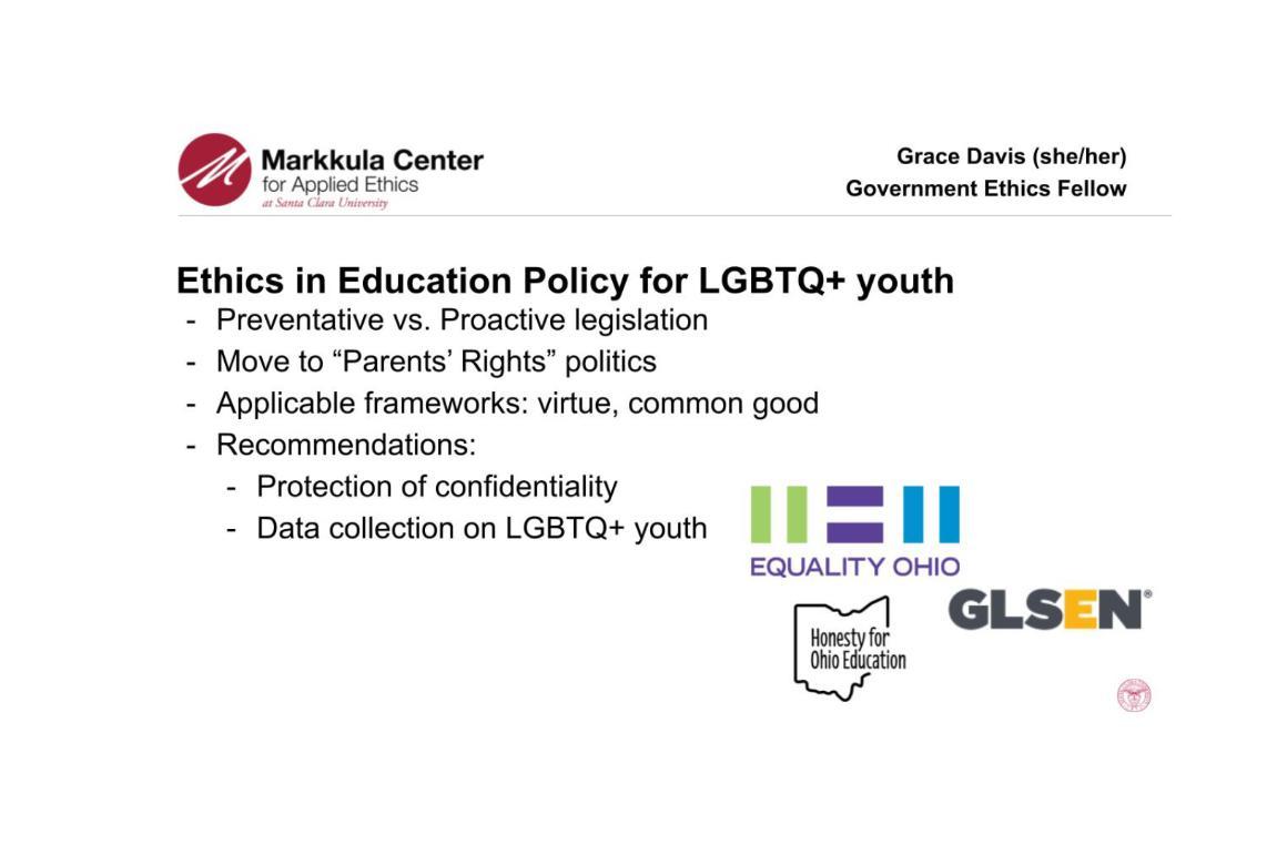 Grace Davis ’25 discusses ethics in education policy for LGBTQ+ youth, using the Framework for Ethical Decision Making to evaluate such policies.