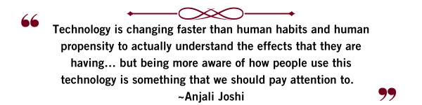 Anjali is hopeful about the next generation of technology developers and how the Ethics Center’s values will guide them toward positive outcomes. “There are so many issues that are boiling up and it’s almost unfair to lay it solely on the shoulders of future generations, but I do think that they are also very capable and will take the right approaches in these types of things. I think it’s important that future generations are aware, conscious, and intentional while also being pragmatic in terms of understanding the consequences of what they are doing. I think we should all support them, give them the benefit of learning and experience, and arm them for the next stages of their career and life.”