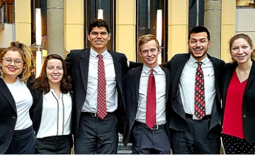 SCU Ethics Bowl team members (left to right): Lia Petronio, Kelly Fradet, Anthony Mejia, Jeffrey Kampfe, Miles Elliott,