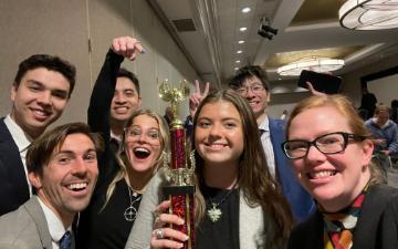 Liam McBride ‘24 (Economics, Political Science, Religious Studies, and current Hackworth Fellow) was also a team member and helped the team qualify for Nationals. Unfortunately, he was unable to travel with the team to the final’s competition. The team is coached by Erin Bradfield, a senior lecturer in philosophy and faculty scholar at the Markkula Center. The team is sponsored by the Markkula Center and the Department of Philosophy.