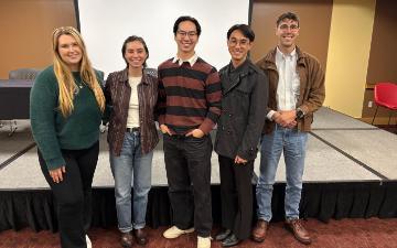 SCU alumni at World Philosophy Day event sponsored by the SCU College of Arts and Sciences. (left to right: Johana Engstrom '22, Clare MacMillin '23, Dorian Clay '22, Keith Dinh '25, Eric Johnson '14). Photo Credit: Christine Wieseler/Santa Clara University College of Arts and Sciences