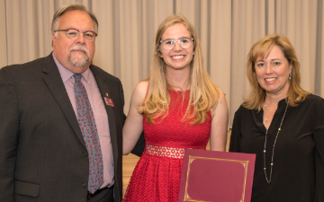 Executive Director Don Heider and Advisory Board member Kristi Bowers presented this year's Markkula Prize to bioengineering major Madeline Eiken, at the Center's June 14th Student Recognition Event. Eiken, a Hackworth Fellow, led a bioengineering project involving writing materials and cases to support the teaching of ethics in bioengineering courses. She also consulted with engineering and chemistry faculty to determine what resources would be helpful to them, and reviewed the Center's software engineering module and Framework for Ethical Thinking, formulating ethics questions and case-based teaching materials. Through storytelling and narrative ethics, Eiken has provided uncommon wisdom for patients facing serious diagnoses and those who care for and care about them. In his comments, Heider noted she is "a remarkable student and an even more remarkable person, who teases everyday ethics from everyday life." Eiken also was awarded SCU's St. Clare medal at Commencement.