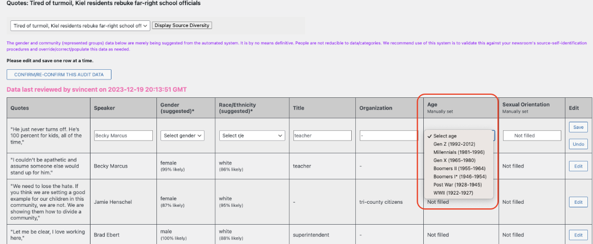 Newsroom staff can now confirm that they reviewed the source diversity annotations for an article, and log the date of confirmation along with the user. This is a signal that all API server’s (machine-generated) annotations for quotes and source identity (gender, race/ethnicity, title, etc.) have been manually reviewed. This means an editor or reporter or newsroom staff member will now be able to tell whether an already annotated article has been review-confirmed for the Source Diversity/DEI data or not. (Credit: Wisconsin Watch, Coburn Dukehart; Seattle Times.)