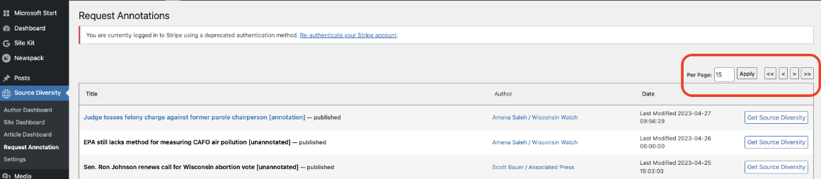 Our original release simply listed all annotatable articles in the system in sortable order. We have now implemented a similar approach to the WordPress All Posts UX. This also made the database access more efficient, fixing a scaling issue.