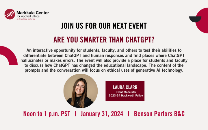 An interactive opportunity for students, faculty, and others to test their abilities to differentiate between ChatGPT and human responses and find places where ChatGPT hallucinates or makes errors. The event will also provide a place for students and faculty to discuss how ChatGPT has changed the educational landscape. The content of the prompts and the conversation will focus on ethical uses of generative AI technology.