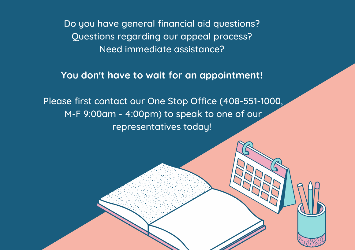 For immediate assistance and for answers to general financial aid questions, please first contact the One Stop Office (408-551-1000, M-F 9:00am-4:00pm).