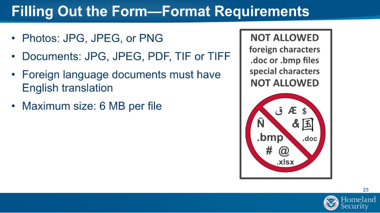 We recommend that you collect all required documents before you log in to the USCIS online system. You can save them in a folder on your computer. Be sure to label the documents clearly and follow the size, format, and labeling guidelines below.