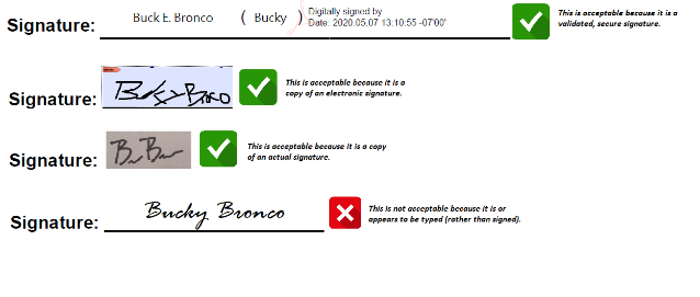 If you opt for the electronic signature, the signature must have a verification mark or be a signature. Typed signatures or signatures with a typed appearance are not accepted. Programs such as DocuSign or Adobe Sign have this feature. Please see below for an example.