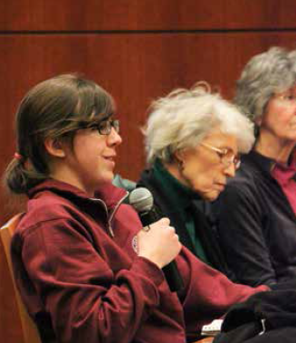 7. Each quarter, Santa Clara University faculty are invited to collaboratively plan the Bannan Institute lecture series and associate their related courses with pertinent lectures. Here, a student in Professor Oliver Putz’s Religious Studies course Religion and Science: Friends or Foes? asks a question at a Winter 2014 lecture linked with his course. |