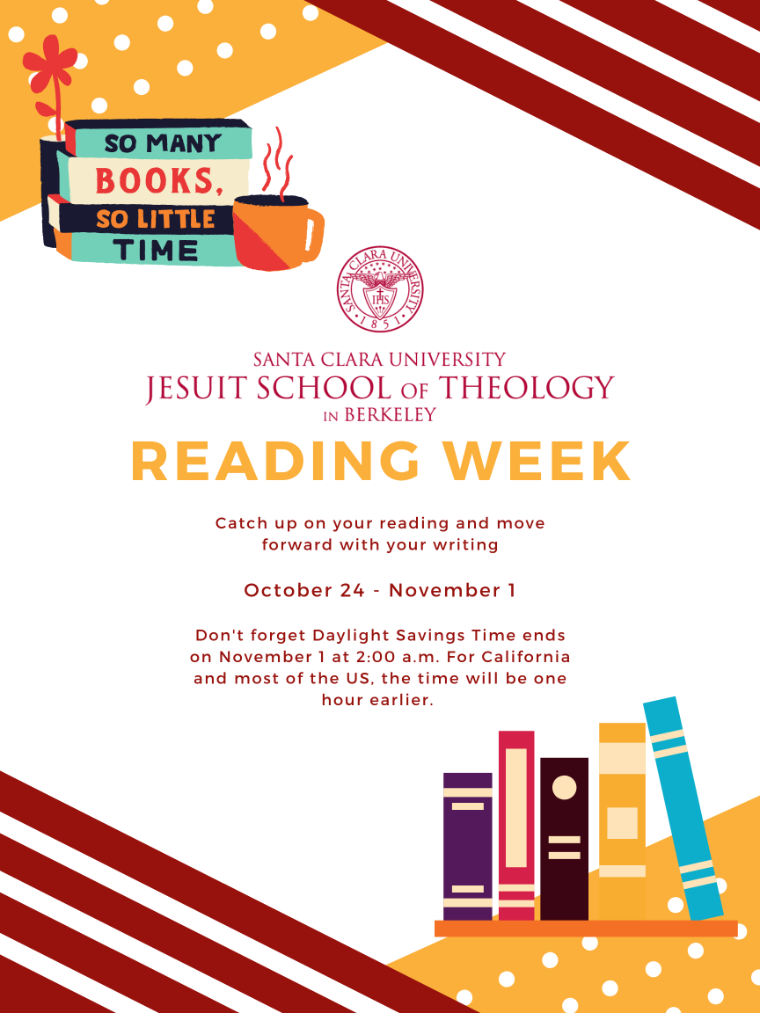 Starting October 27, the GTU library will be opening to reservations for 2-hour blocks of quiet study, using your scu or gtu email addresses when you make the reservation. For instructions on how to reserve a spot and what to expect, click here. You will still be able to access the library's resources remotely. You will need your SCU ID number for checking out materials, unless you have a GTU library card from the past, in which case you can use that bar code. Please note that reference librarians are only available via chat or email at library@gtu.edu from 10:00 a.m. - 4:00 p.m.