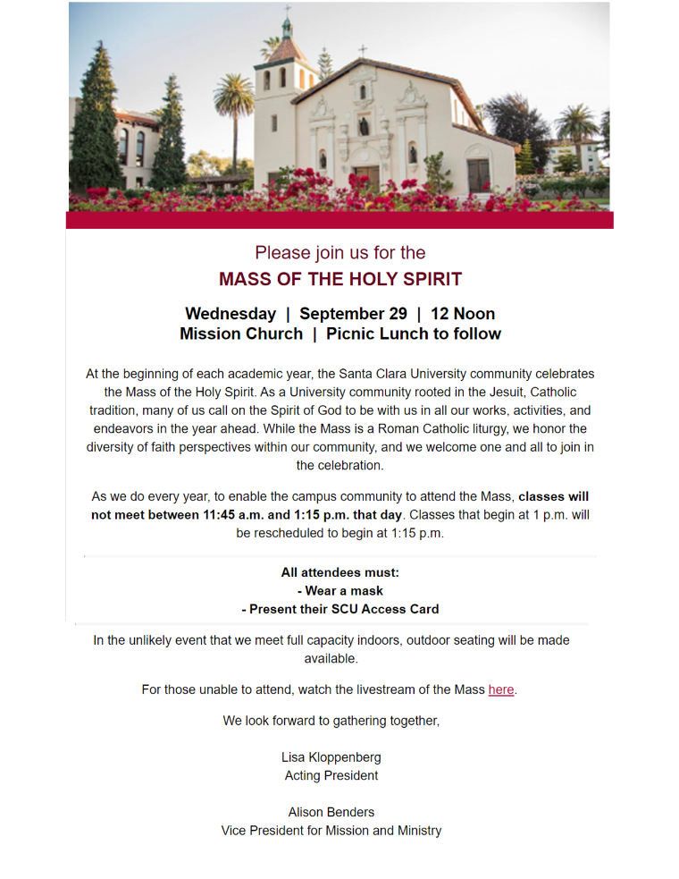 Join the entire Santa Clara University Community for a special Mass followed by a picnic on the St. Ignatius lawn. Mask and SCU ACCESS ID required to attend. Those unable to attend the Mass in person may access the livestream here.