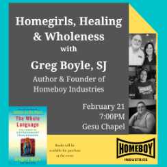 Greg Boyle, SJ, founder of Homeboy Industries, joins JST for a conversation with Laura Miera, Homeboy Industries Educator, and JST Student, for a conversation about his new book, The Whole Language, accompanied by women who found faith, renewal, and community after gangs and incarceration. Fr. Greg's book will be available for purchase (cash only) at the event.