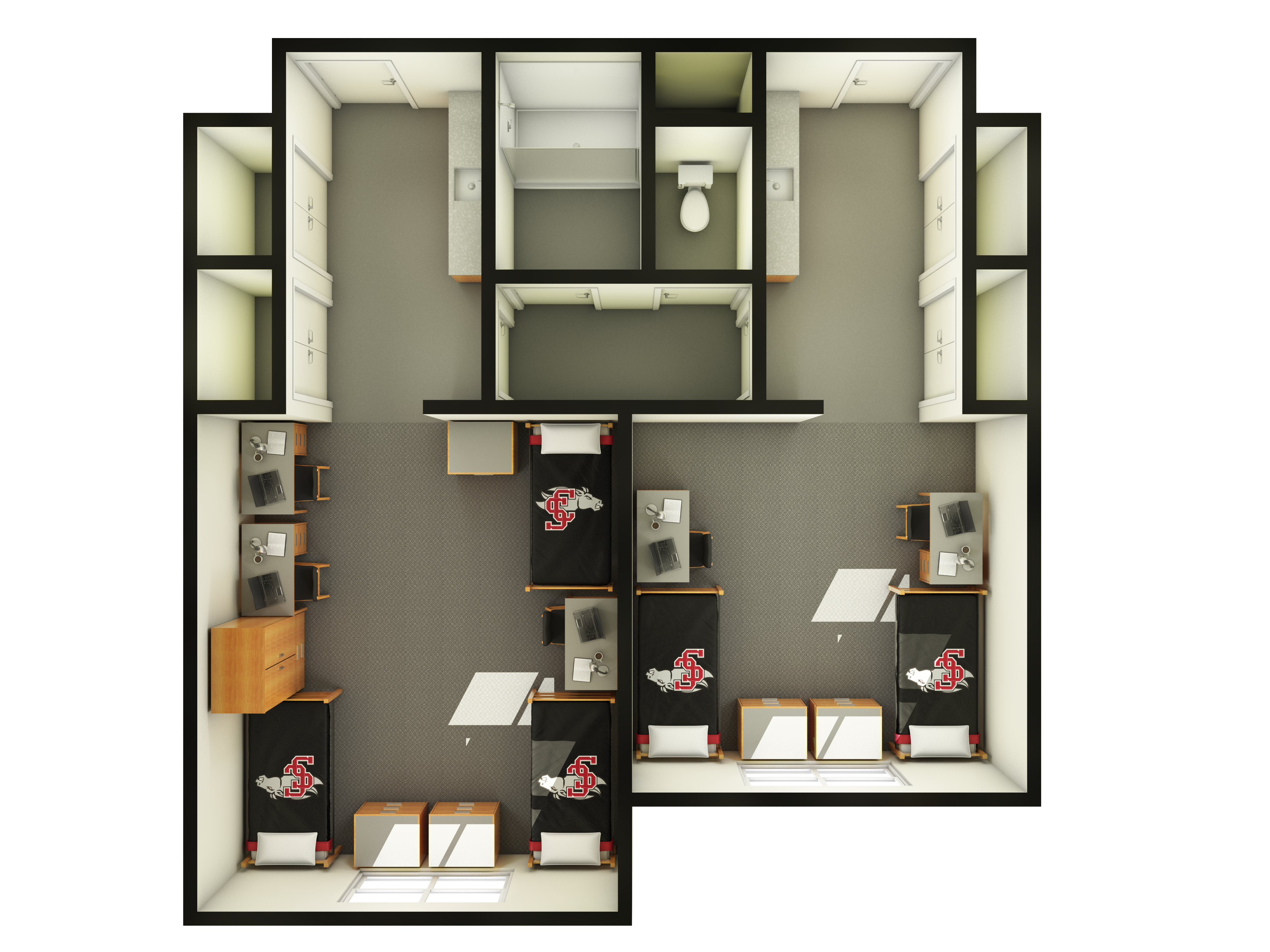 Finn is a four-story building housing about 360 residents in two-room mini-suite doubles or triples, each sharing a bathroom with separate toilet and shower areas. Each resident is provided with a twin XL bed, desk, rolling desk cabinet, chair, and three stacking dresser drawers, along with shared closet and vanity space. All rooms have air conditioning.
