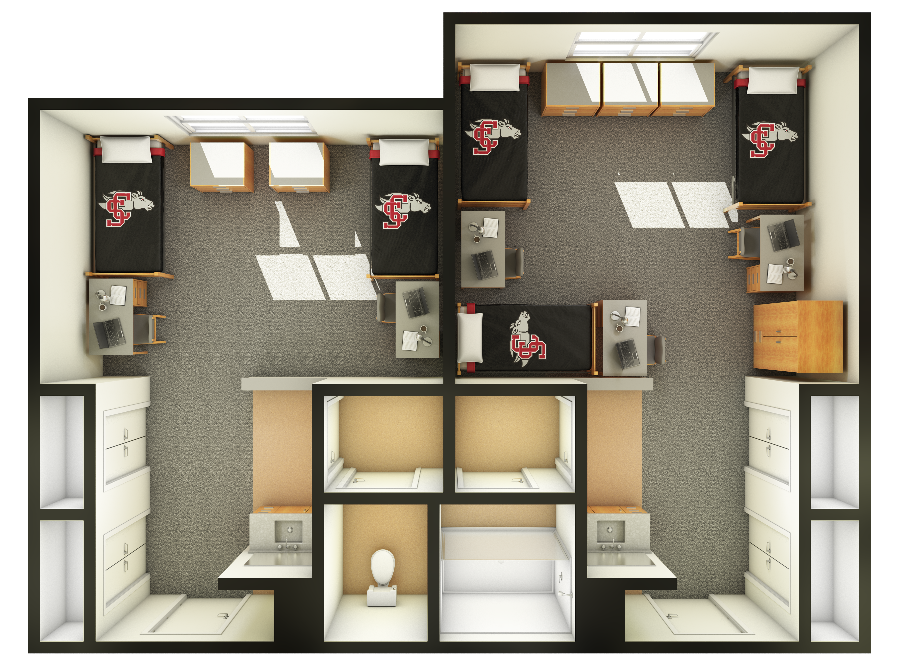 Graham Hall has four floors and 12 residential wings, each housing about 32 residents and a Community Facilitator. Students live in two-room mini-suite doubles or triples, each sharing a bathroom with separate toilet and shower areas and are provided with a bed, desk, chair, dresser, and shared closet/vanity space. All rooms have air conditioning. All rooms have air conditioning.