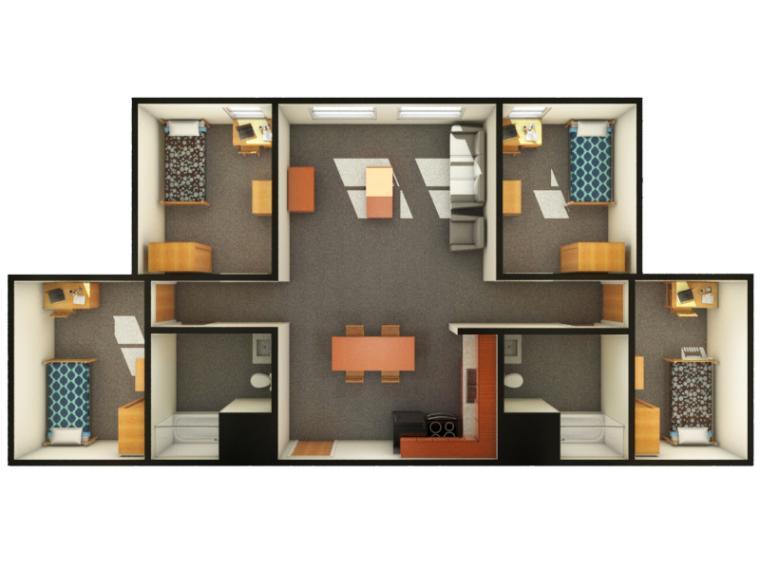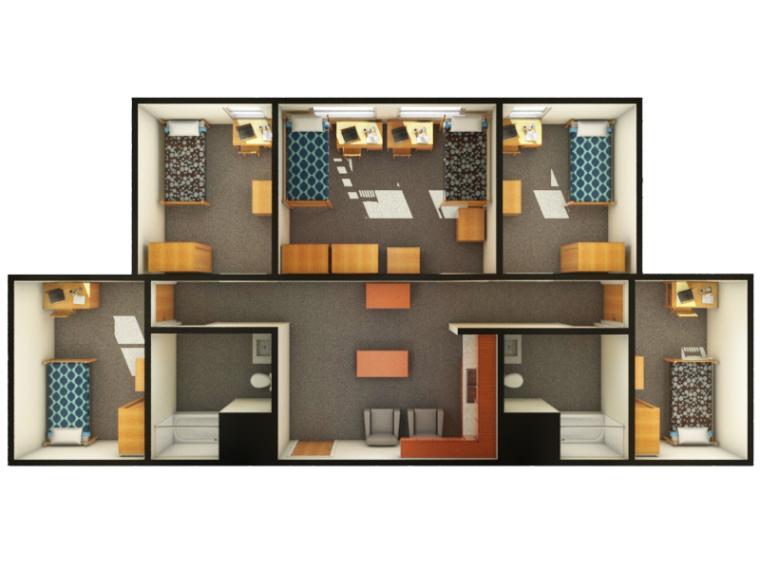 Suite double room graphic designed to show all provided furnishings. Actual layout is a lofted bed with desk and 3 drawer dresser underneath for each student. Wardrobe provided as pictured.