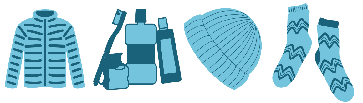 Large tarps, new socks, toothpaste, toothbrushes, masks, wet wipes, hand sanitizer, new or gently used warm clothing (especially larger men's sizes), deodorant, menstrual hygiene products, hats, and scarves. Financial support is also greatly appreciated.