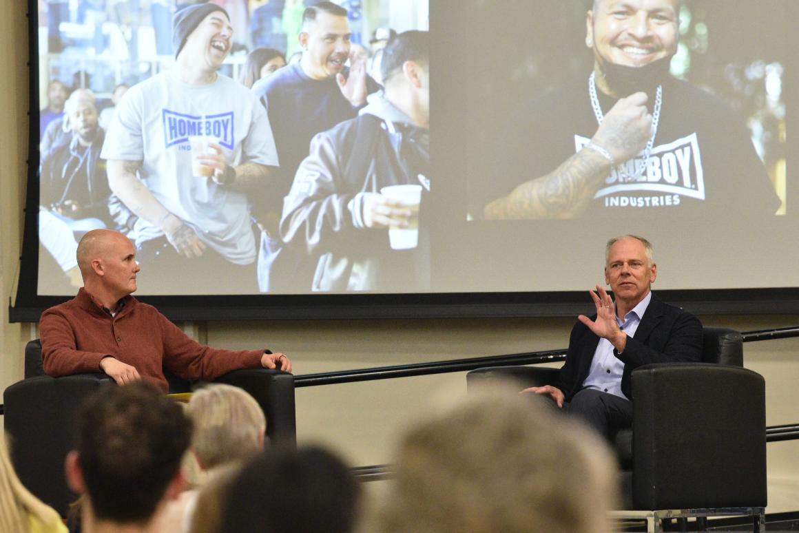 On Tuesday, November 15, the theme was solidarity and kinship. Tom Vozzo, CEO of Homeboy Industries, was invited to share his experiences on being called to leadership in a nonprofit that changed the trajectory of his life. Homeboy Industries is the largest gang-rehabilitation program in the United States. Recognizing the dichotomy of America, one of privilege and the other of the demonized and poor, Tom left corporate America as CEO of Aramark, to invest in the lives of a forgotten and marginalized community. Speaking humbly to the crowd of SCU staff, faculty, and students, Tom enlightened everyone, “In this society, we have a concept of meritocracy. Believing in this concept, I wanted to justify why I became successful, as opposed to worrying about other people. I knew by my own hard work, smarts, and ability, I would do well in life. But, the American dream isn’t attainable to everyone in life. If we’re going to help lift the poor in our society, we need to understand meritocracy doesn’t exist.” His final words left a palpable impact on SCU’s community: “Let’s lift more people up in our society. Find joy in others. And by doing that, we become more joyful.” Tom’s journey in his work reflects SCU’s value of solidarity and kinship by exemplifying what it means to be in work with and for marginalized members of society.