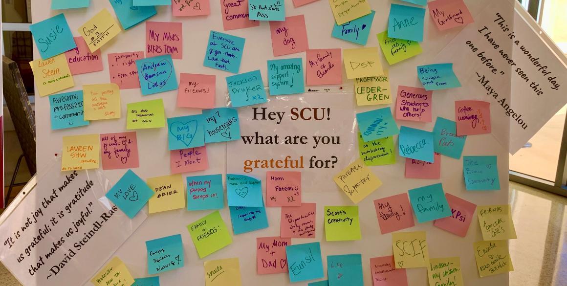 Thursday, November 17 honored the theme of cura personalis, a Latin phrase that means “care for the entire person.” In alignment with this theme, the Lunchtime Examen, hosted weekly by the Ignatian Center each Thursday, was highlighted. The Examen was started by St. Ignatius of Loyola to mindfully reflect on the day and on the presence of the Divine within each of us. As part of SCU’s celebration of Gratitude Month in November, the Gratitude Project, was held for students to write thank you cards for people they are grateful for in their lives. These events encouraged cura personalis by allowing students to be challenged intellectually, morally, and spiritually to engage with others fully.