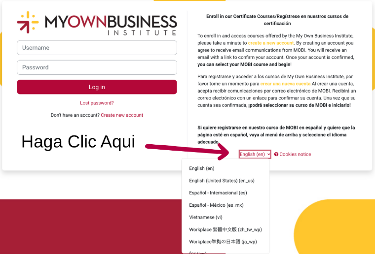 Si prefiere ver el formulario de creación de cuenta en otro idioma, debe cambiar su preferencia de idioma antes de hacer clic en “Crear mi cuenta nueva”. Esta es la página que aparece cuando usted selecciona “Inscríbase ahora” o “El Login de los Cursos” desde la página principal de MOBI. (Vea la imagen a continuación). Haga clic en “English (en)” en la esquina inferior derecha de la pantalla. Aparecerá un menú desplegable donde podrá seleccionar el idioma que usted prefiera. Las instrucciones en esta pantalla se actualizarán al idioma seleccionado, al igual que las páginas siguientes dentro de este sistema de aprendizaje. Por lo tanto, si usted hace clic en “Comience ahora creando una cuenta nueva” después de elegir un idioma, la página para crear la cuenta mostrará los campos en el idioma que ha elegido.