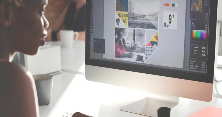 Una mujer se sienta frente a su computadora y modifica una imagen.