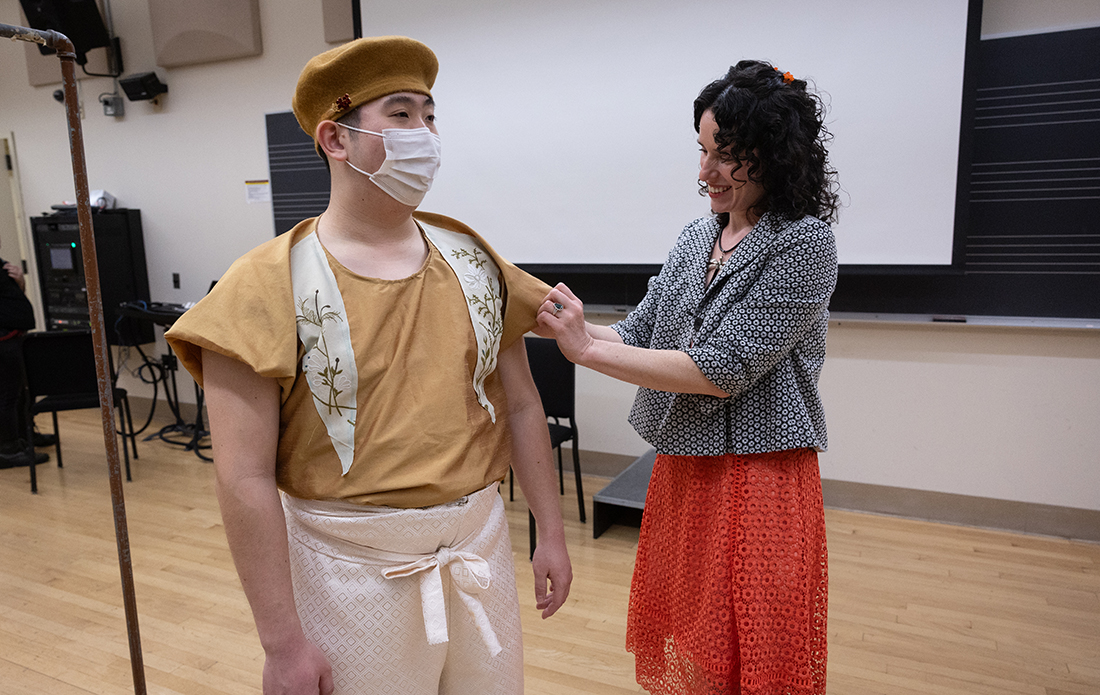Finally, ribbons once used for gift wrap were used to tie the top, both front and back, on Jones’ student model Sean Tsang ’27. The adjustable-sized work-to-evening wear outfit even won her the award for “Most Imaginative Design.”