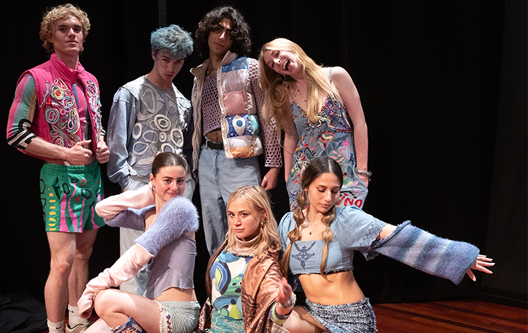 A group of students pose in upcycled designs they modeled in the show.