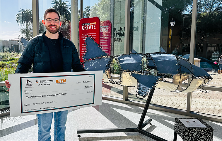 It was in Carrington’s advanced sculpture class that Schumacher began welding a 10-foot-long, wire-frame whale shark for an assignment. Then, after collaborating with his twin brother, bioengineer Karl Schumacher ’24, M.S. ’25, their moving sculpture “Rhincodon typus” would go on to win the School of Engineering’s 2024 Kinetic Design Challenge, netting them the grand prize of $2500.