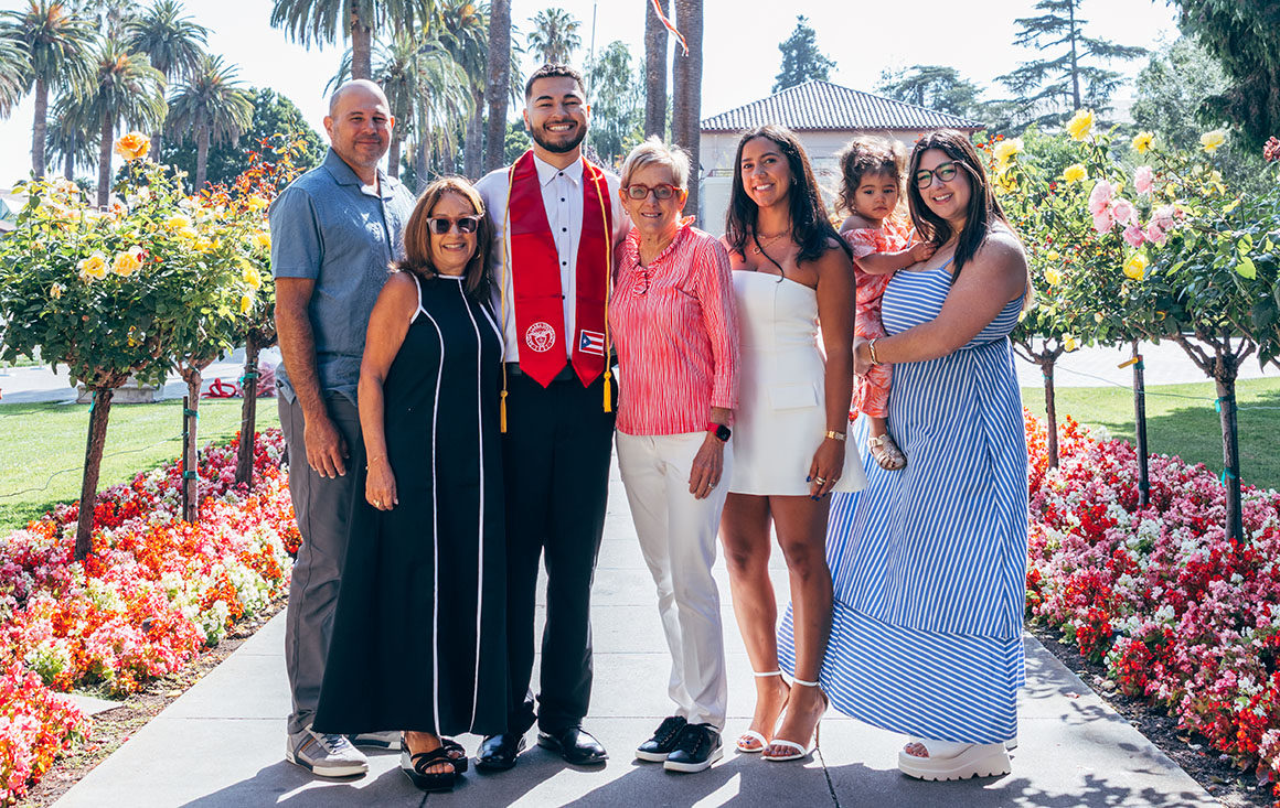 Eventually, I want to complete a Master’s program in Public Health. For now, I plan to return home to Puerto Rico after graduation and look for a job within the Department of Public Health that works with community organizations. I want to make an impact and apply that hands-on experience to my future studies. Mercado poses with his family and President Sullivan on campus. | Photo by Miguel Ozuna