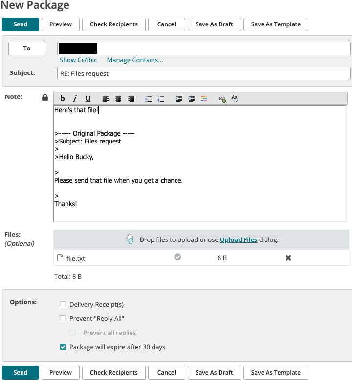 - Delivery Receipt(s): You (the sender) receive a notification email when each recipient of your package reads the package for the first time, and when a recipient downloads a file. If you selected another user in the From: field, both you and the other user receive a delivery receipt.