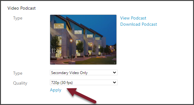 The default resolution for Panopto server is 720p at 30fps. Selecting a higher resolution for podcast download will only increase the size of the video, but not improve the quality.
